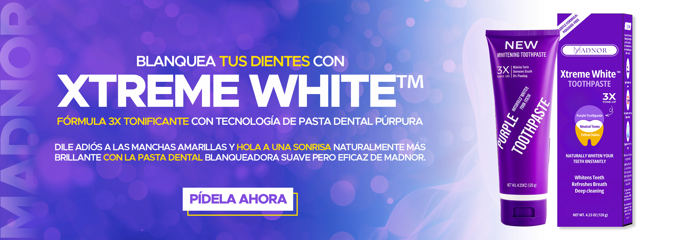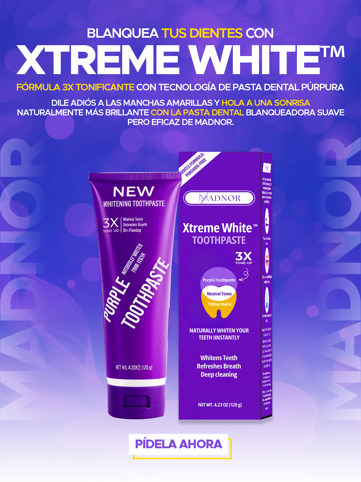 Madnor Xtrem White es una pasta dental blanqueadora de última generación formulada para eliminar manchas, combatir la placa y fortalecer el esmalte, todo en un solo paso.